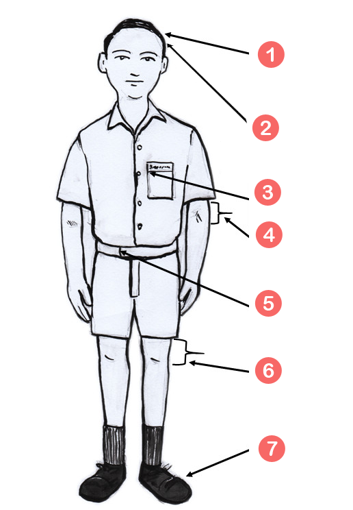 Boys (6-9) Cut the hair short. The school badge should be sewn to the right and top corner of the pocket. 4 inches from the tip of the arm to the elbow. The end of the body part should be 2 1/2 inches from the edge of the zipper. The distance between the bottom edge of the pants and the knee is 2 inches. Wear black socks and black shoes. Watches are strictly prohibited for uniforms.